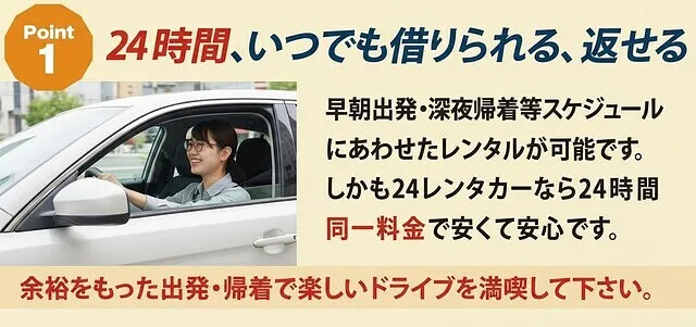 旅行の計画も、レンタカーの営業時間を気にせず、24時間いつでも借りられて・いつでも返せるので、もう時間を気にしなくても、大丈夫なんです!