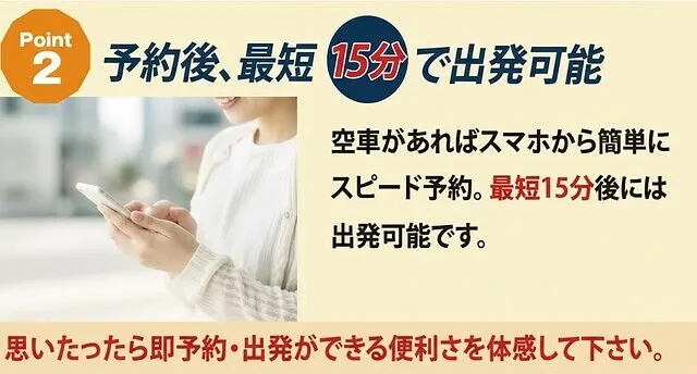 出発15分前までの、インターネットからのご予約で、最短1分で出発出来ます。